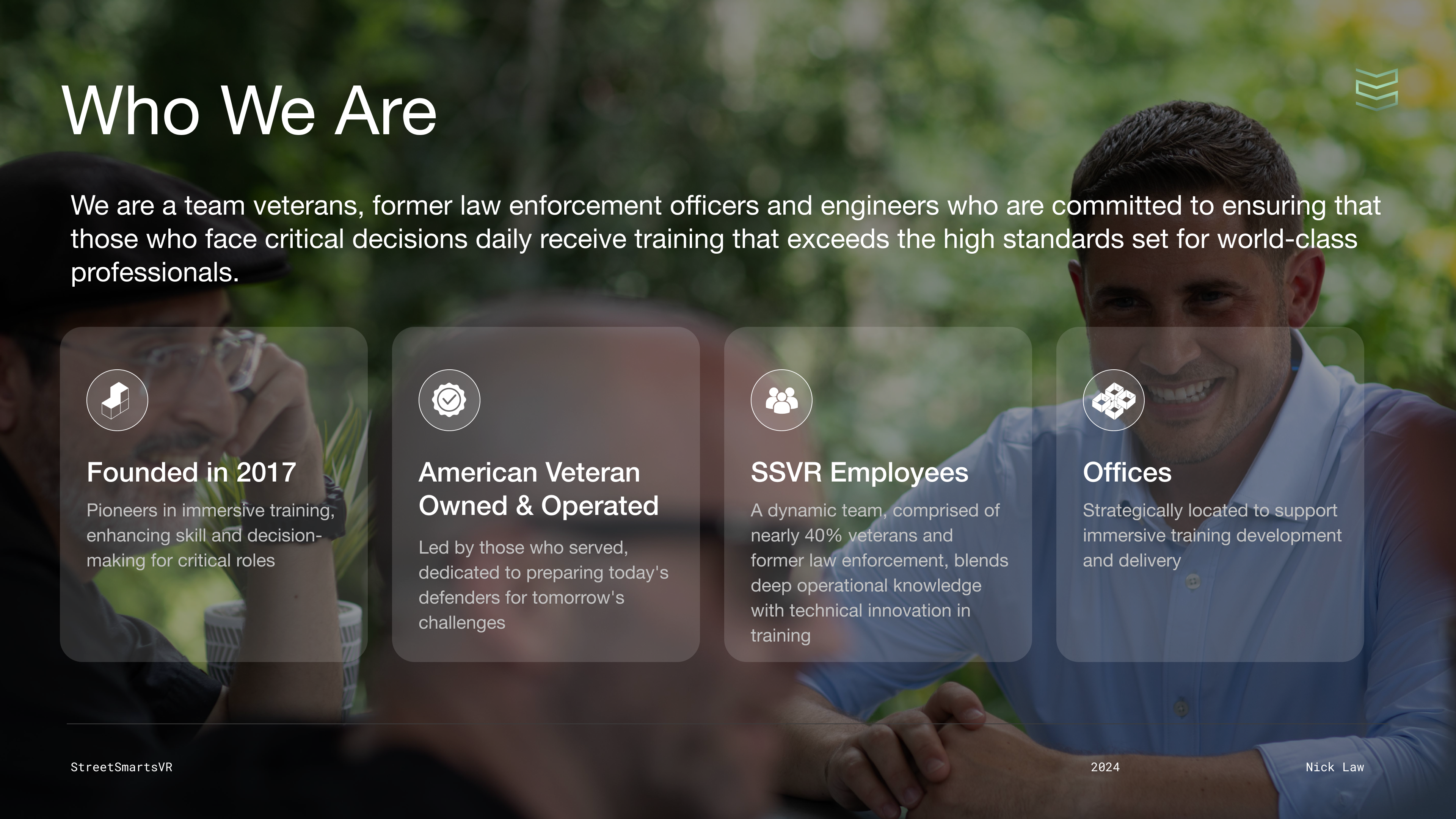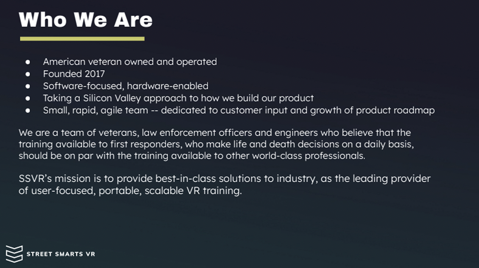 Establish SSVR as a premier provider of immersive training solutions for DoD, law enforcement, and security sectors.