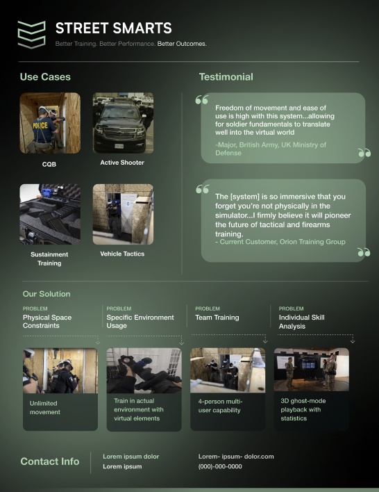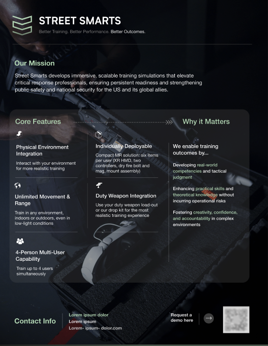 Street Smarts VR (SSVR) is an industry leader in immersive training solutions, providing Virtual Reality (VR) and Mixed Reality (MR) simulations. I drove marketing efforts to increase brand awareness, support sales enablement, drive customer engagement, and position SSVR as a trusted partner for U.S. Department of Defense (DoD) programs and public safety agencies.